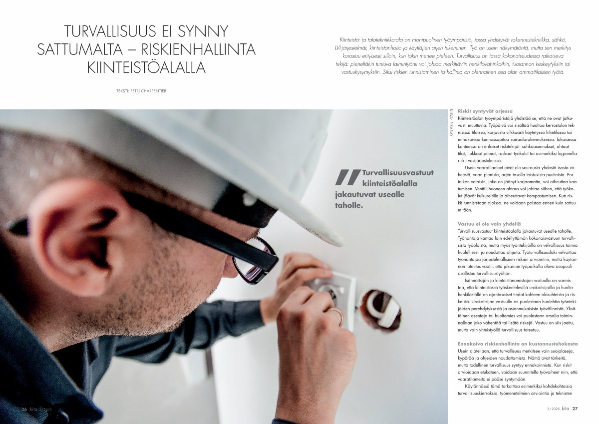 Riskit syntyvät arjessa Kiinteistöalan työympäristöjä yhdistää se, että ne ovat jatkuvasti muuttuvia. Työpäivä voi sisältää huoltoa kerrostalon teknisissä tiloissa, korjausta vilkkaasti käytetyssä liiketilassa tai ennakoivaa kunnossapitoa sairaalarakennuksessa. Jokaisessa kohteessa on erilaiset riskitekijät: sähköasennukset, ahtaat tilat, liukkaat pinnat, raskaat työkalut tai esimerkiksi legionellariskit vesijärjestelmissä.