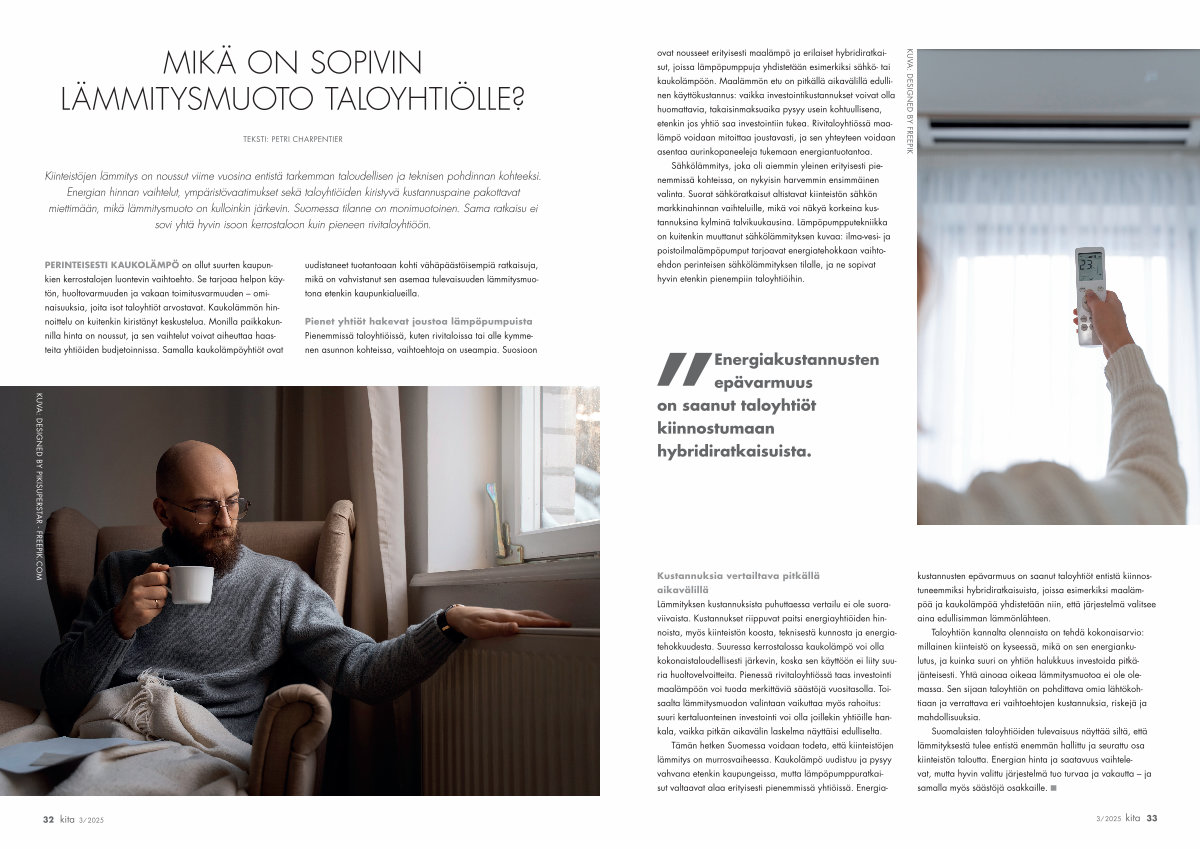Suomalaisten taloyhtiöiden tulevaisuus näyttää siltä, että lämmityksestä tulee entistä enemmän hallittu ja seurattu osa kiinteistön taloutta. Energian hinta ja saatavuus vaihtelevat, mutta hyvin valittu järjestelmä tuo turvaa ja vakautta – ja samalla myös säästöjä osakkaille. n