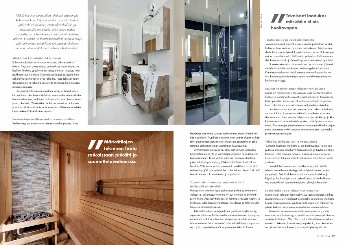 Märkätilat ovat kiinteistöjen teknisesti vaativimpia kokonaisuuksia. Kylpyhuoneet ja saunat altistuvat jatkuvalle kosteudelle, lämpötilavaihteluille ja mekaaniselle rasitukselle, mikä tekee niiden suunnittelusta, toteutuksesta ja ylläpidosta kriittisen tärkeää. Kiinteistö- ja talotekniikka-alalla huomio siirtyy yhä vahvemmin esteettisistä ratkaisuista tekniseen laatuun, riskienhallintaan ja elinkaarikustannuksiin.