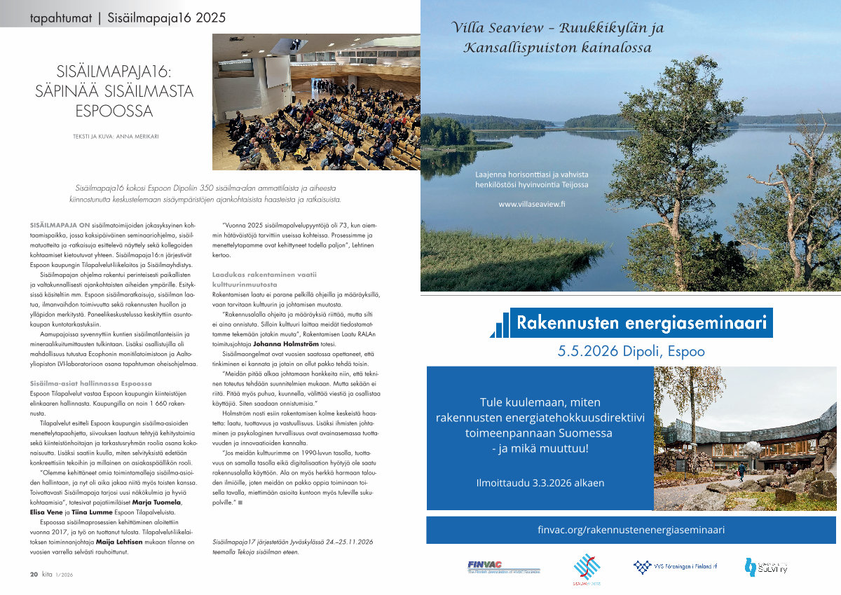 SISÄILMAPAJA ON sisäilmatoimijoiden jokasyksyinen kohtaamispaikka, jossa kaksipäiväinen seminaariohjelma, sisäilmatuotteita ja-ratkaisuja esittelevä näyttely sekä kollegoiden kohtaamiset kietoutuvat yhteen. Sisäilmapaja16: n järjestivät Espoon kaupungin Tilapalvelut-liikelaitos ja Sisäilmayhdistys.