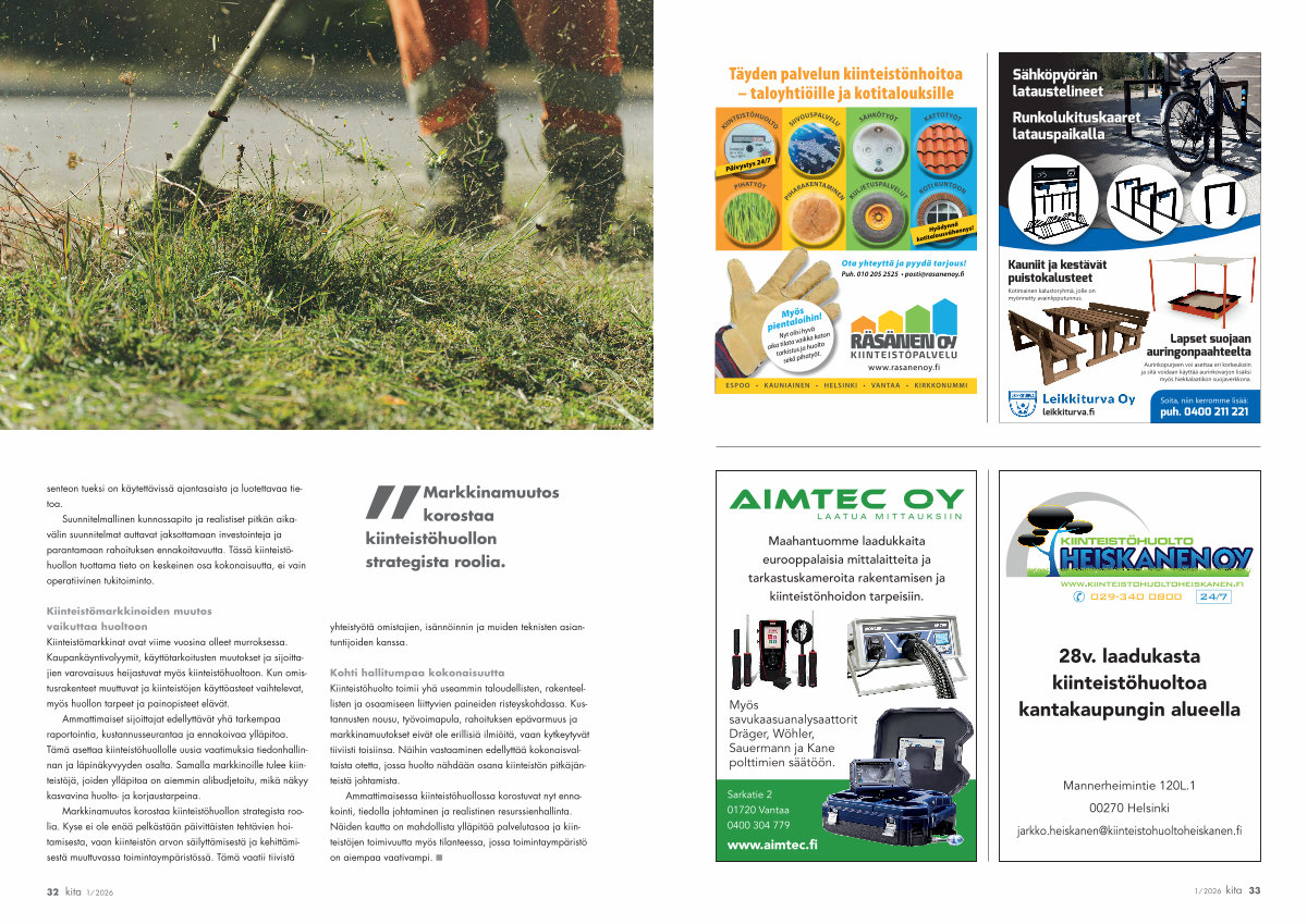 Kohti hallitumpaa kokonaisuutta Kiinteistöhuolto toimii yhä useammin taloudellisten, rakenteellisten ja osaamiseen liittyvien paineiden risteyskohdassa. Kustannusten nousu, työvoimapula, rahoituksen epävarmuus ja markkinamuutokset eivät ole erillisiä ilmiöitä, vaan kytkeytyvät tiiviisti toisiinsa. Näihin vastaaminen edellyttää kokonaisvaltaista otetta, jossa huolto nähdään osana kiinteistön pitkäjänteistä johtamista.