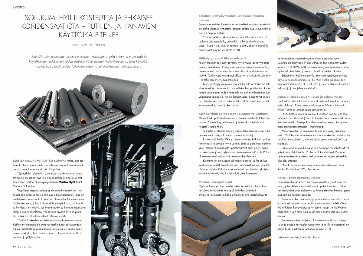 ” Tämän päivän LVI-suunnitelmissa solukumi on vahvasti mukana eristyspuolella, esimerkiksi ulko- ja jäteilmakanavissa”, lisää Hjelt, joka on toiminut Saint-Gobain Finlandilla eristeasiantuntijana vuodesta 2010.