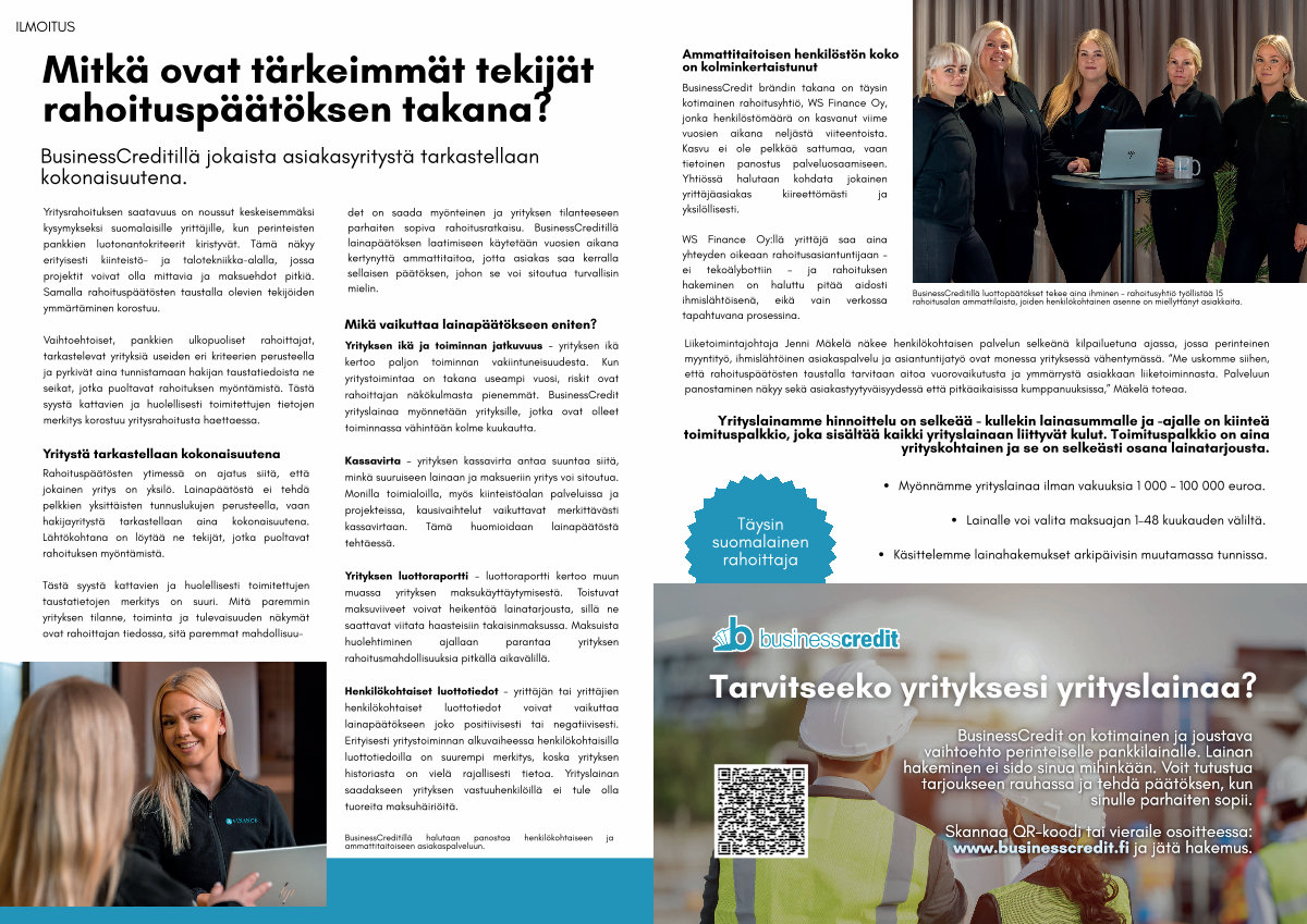 BusinessCredit brändin takana on täysin kotimainen rahoitusyhtiö, WS Finance Oy, jonka henkilöstömäärä on kasvanut viime vuosien aikana neljästä viiteentoista. Kasvu ei ole pelkkää sattumaa, vaan tietoinen panostus palveluosaamiseen. Yhtiössä halutaan kohdata jokainen yrittäjäasiakas kiireettömästi ja yksilöllisesti.