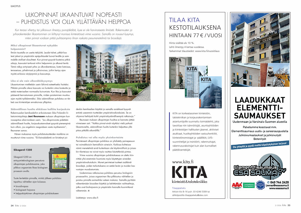 KITA on korkeatasoinen kiinteistön, talotekniikan ja korjausrakentamisen asiantuntijoille suunnattu toimialalehti, joka tavoittaa niin isännöitsijät, asuntoyhtiöiden ja kiinteistöjen hallitusten jäsenet, aktiiviset asukkaat, huoltoyhtiöiden vastuuhenkilöt, kiinteistönomistajat ja ‐päälliköt, LVISsuunnittelijat ja insinöörit, rakennuttajat, rakennusurakoitsijat kuin alan kunnalliset päätöksentekijät.