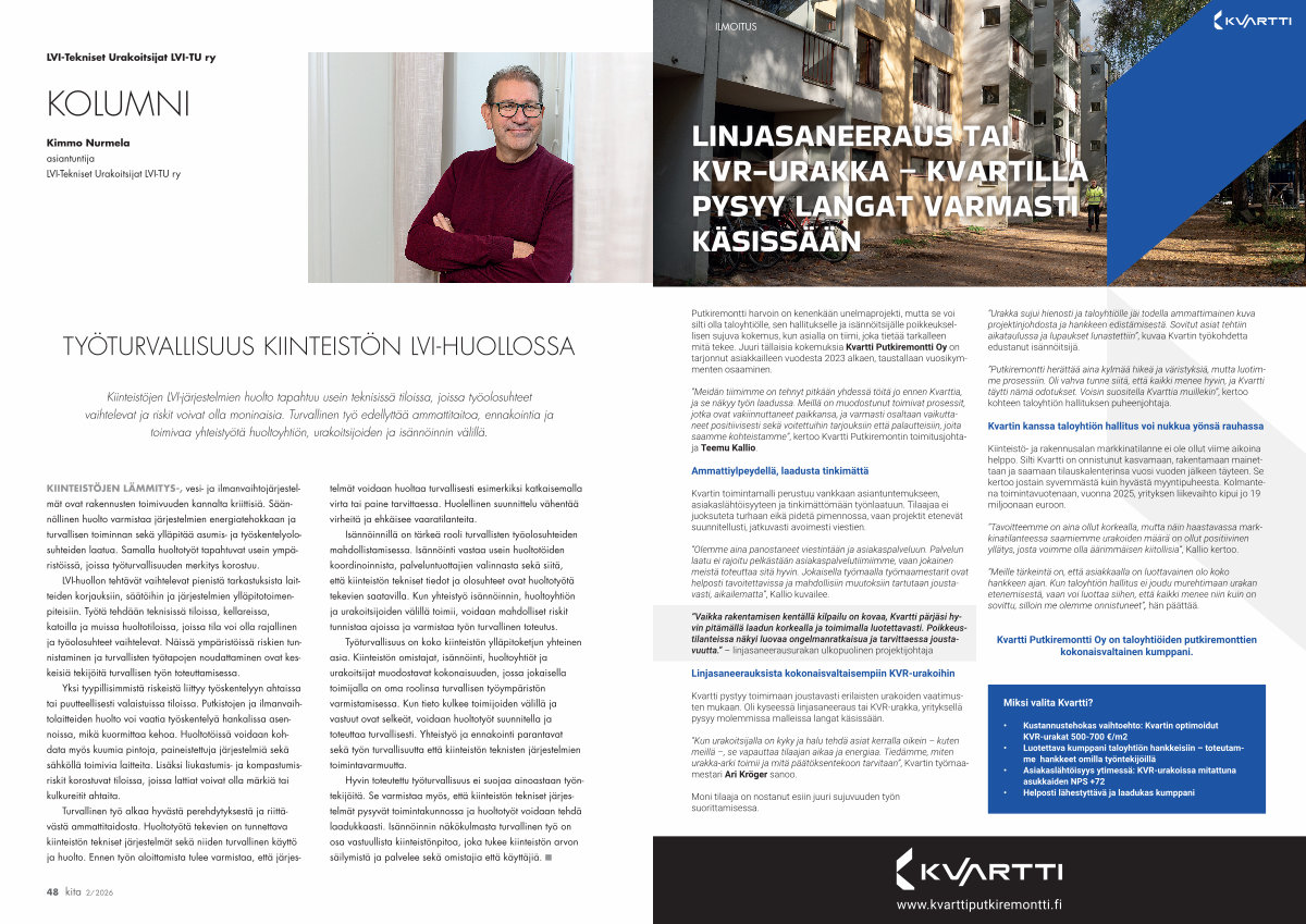 Kiinteistöjen LVI-järjestelmien huolto tapahtuu usein teknisissä tiloissa, joissa työolosuhteet vaihtelevat ja riskit voivat olla moninaisia. Turvallinen työ edellyttää ammattitaitoa, ennakointia ja toimivaa yhteistyötä huoltoyhtiön, urakoitsijoiden ja isännöinnin välillä.