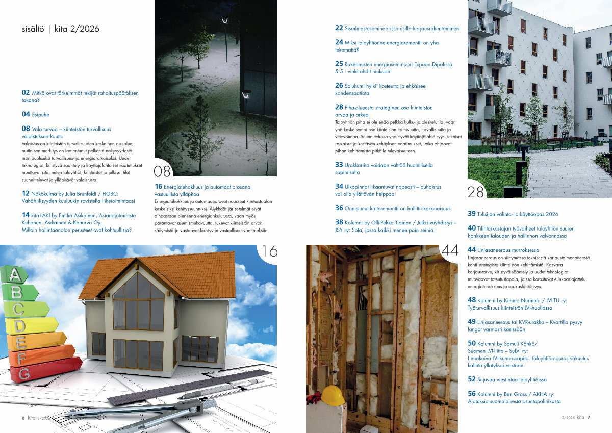 44 Linjasaneeraus murroksessa Linjasaneeraus on siirtymässä teknisestä korjaustoimenpiteestä kohti strategista kiinteistön kehittämistä. Kasvava korjaustarve, kiristyvä sääntely ja uudet teknologiat muovaavat toteutustapoja, joissa korostuvat elinkaariajattelu, energiatehokkuus ja asukaslähtöisyys.