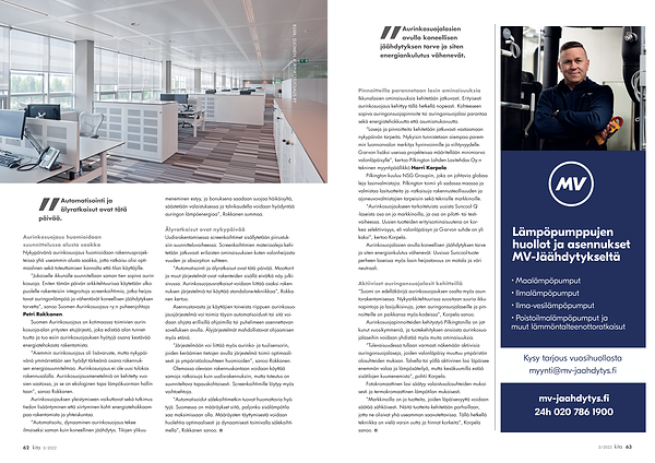 ” Automatisointi ja älyratkaisut ovat tätä päivää . Moottorit ja muut järjestelmät ovat rakenteiden sisällä eivätkä näy julkisivussa . Aurinkosuojausratkaisut voidaan liittää osaksi rakennuksen järjestelmiä tai käyttää standalone-tekniikkaa ”, Rokkanen kertoo .