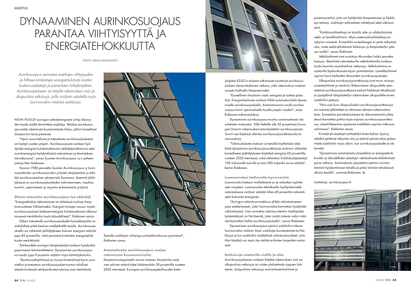 ” Koneellinen ilmastointi vaatii energiaa ja tuottaa päästöjä . Energiankulutusta voidaan hillitä automatisoidulla dynaamisella aurinkosuojauksella . Automatisoinnin avulla aurinkosuojaus toimii optimaalisella tavalla ympäri vuoden ”, avaa Rokkanen tutkimustuloksia .