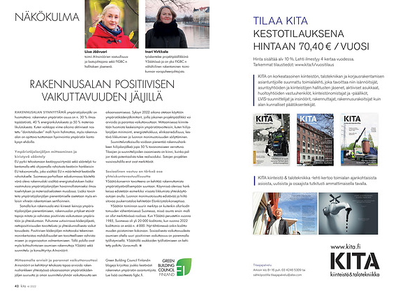 KITA on korkeatasoinen kiinteistön , talotekniikan ja korjausrakentamisen asiantuntijoille suunnattu toimialalehti , joka tavoittaa niin isännöitsijät , asuntoyhtiöiden ja kiinteistöjen hallitusten jäsenet , aktiiviset asukkaat , huoltoyhtiöiden vastuuhenkilöt , kiinteistönomistajat ja ‐päälliköt , LVIS‐suunnittelijat ja insinöörit , rakennuttajat , rakennusurakoitsijat kuin alan kunnalliset päätöksentekijät .