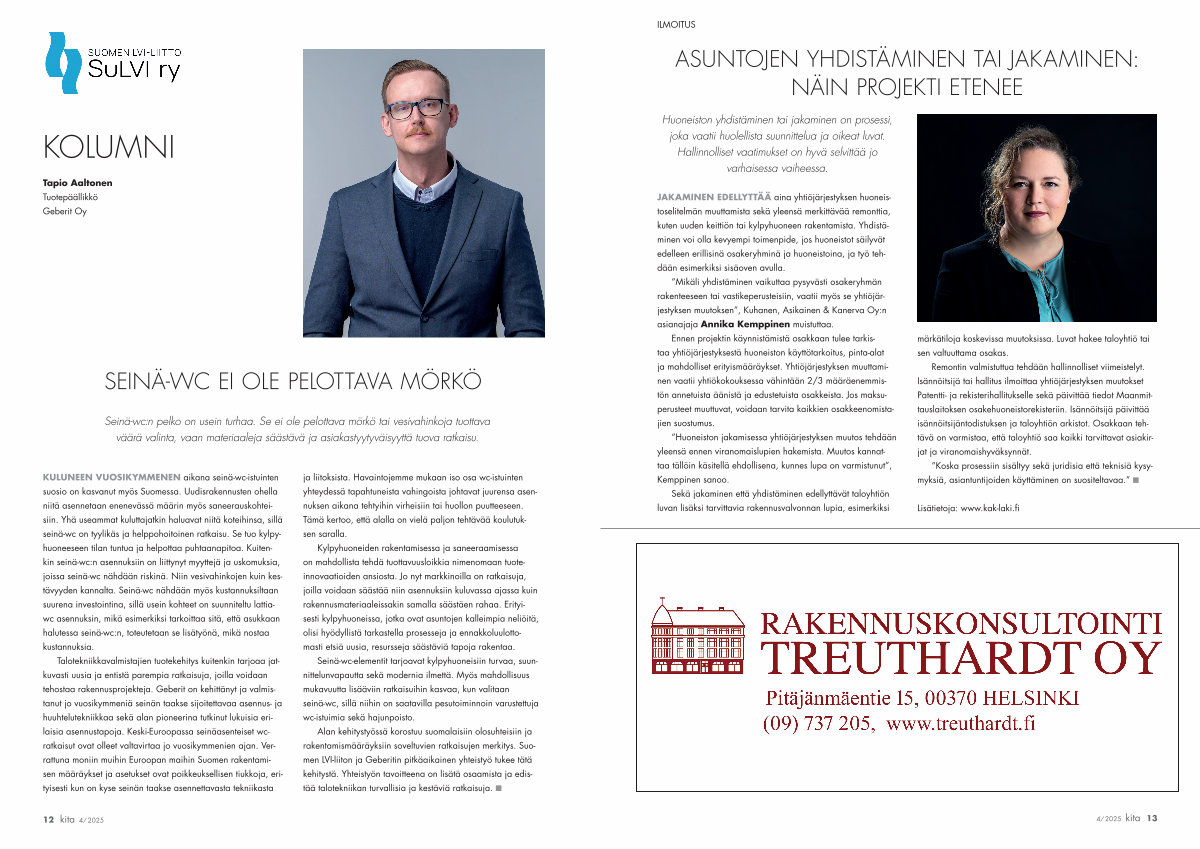 Alan kehitystyössä korostuu suomalaisiin olosuhteisiin ja rakentamismääräyksiin soveltuvien ratkaisujen merkitys. Suomen LVI-liiton ja Geberitin pitkäaikainen yhteistyö tukee tätä kehitystä. Yhteistyön tavoitteena on lisätä osaamista ja edistää talotekniikan turvallisia ja kestäviä ratkaisuja. n