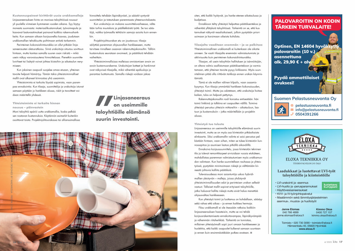 Yhteistyö tuo tulosta Linjasaneeraus on useimmille taloyhtiöille elämänsä suurin investointi, mutta se on myös osa kiinteistön pitkäaikaista elinkaarta. Siksi urakkamallin valinta ei saisi perustua pelkästään hintaan, vaan siihen, miten se tukee kiinteistön kunnossapitoa ja asumisen laatua pitkällä aikavälillä.