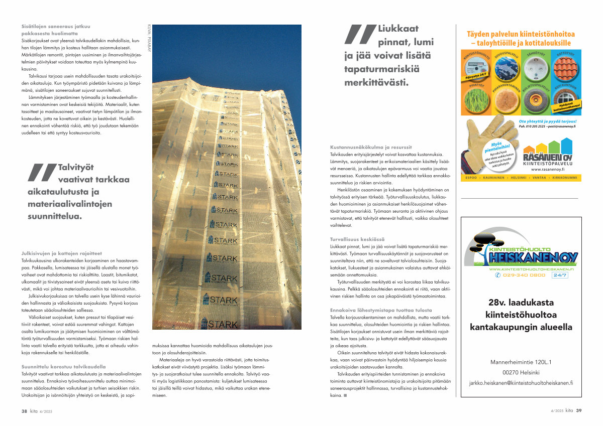 Suunnittelu korostuu talvikaudella Talvityöt vaativat tarkkaa aikataulutusta ja materiaalivalintojen suunnittelua. Ennakoiva työvaihesuunnittelu auttaa minimoimaan sääolosuhteiden vaikutukset ja turhien seisokkien riskin. Urakoitsijan ja isännöitsijän yhteistyö on keskeistä, ja sopi- muksissa kannattaa huomioida mahdollisuus aikataulujen joustoon ja olosuhderajoitteisiin.