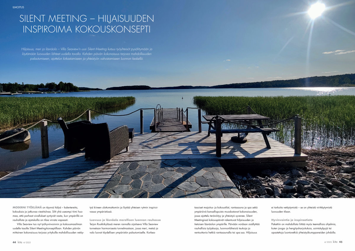 Villa Seaview tuo nyt työhyvinvoinnin ja kokousmaailman uudelle tasolle Silent Meeting-konseptillaan. Kahden päivän mittainen kokonaisuus tarjoaa yrityksille mahdollisuuden vetäy- tyä kiireen ulottumattomiin ja löytää yhteisen rytmin inspiroivassa ympäristössä.