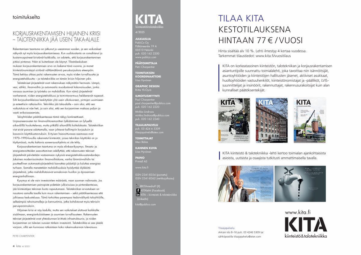 KITA kiinteistö & talotekniikka ‐lehti kertoo toimialan ajankohtaisista asioista, uutisista ja osaajista tutkitusti ammattimaisella tavalla.
