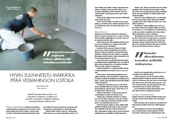 ” Vanhoissa asunnoissa voi olla valuraudasta valmistetut käyttövesiputket 20 senttimetrin syvyydessä rakenteiden sisällä. Ne ovat kosteassa koko ajan, joten ne ruostuvat puhki, eikä putkivuotoja näe. Siksi niiden pitää olla pinnassa”, hän sanoo ja lisää, että mitä nopeammin putkivuodon havaitsee, sitä pienemmät vauriot vesivahinko ehtii aiheuttaa.