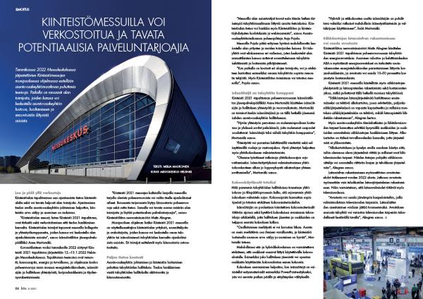 Koronatilanteen vuoksi tammikuulle 2022 siirtynyt Kiinteistö 2021 -tapahtuma järjestetään 12 .– 13.1.2022 Helsingin Messukeskuksessa . Tapahtuman teemoina ovat remontit , kunnossapito , energia ja turvallisuus , ja ohjelmaan kuuluu puheenvuoroja muun muassa energiatehokkuudesta , isännöitsijän ja hallituksen yhteistyöstä , korjaushankkeista ja täydennysrakentamisesta .