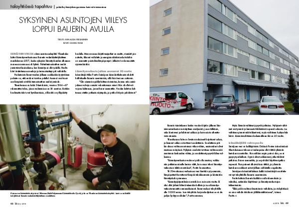 Bauerin toimitukseen kuuluu vuoden käytön jälkeen läm- Myös lämmönvaihtimet pysyvät puhtaina. Nykyiset vaihti- minvesiverkoston vesinäytteen analysointi, jossa tutkitaan, met ovat pieniä ja kennostot tukkiutuvat nopeasti sakasta. Jos onko kiertovesi puhdistunut sakkaa ja korroosiota aiheutta- vaihtimen pienet reiät tukkeutuvat, myös vaihtimen hyötysuhde vista aineista. kärsii. Lämmönvaihtimien laskennallinen ikä on 20 vuotta. Ylisenhaassa laite on luvatun mukaisesti hajottanut sakan, ja liuennut sakka on tarttunut suodattimiin. Suodattimia piti- Isännöitsijöiltä vahva puolto kin alussa vaihtaa muutaman viikon välein, ensimmäiset olivat Seinäjoen vesi on kalkkipitoista. Eräässä Poutun isännöimässä mustassa mönjässä. Nykyisin suodatin tarvitsee vaihtaa enää 8-kerroksisessa talossa ei vedenpaine ollut riittää ylimmän muutaman kuukauden välein, ja suodattimet pysyvät lähes val- kerroksen asuntoihin. Kun suihkun napin painoi alas, se ei koisina. pysynyt paikallaan. Syynä olivat sakkaumat, jotka tukkivat ”Lämmitysverkoston veden ei pidä olla mustaa, vaikka putkistoa. Bauer asennettiin, ja se puhdisti käyttövesiputkia niin putkimies minulle kerran väitti, kun oman taloni lämmitys­ nopeasti. Pian paineet alkoivat taas riittää, ja ylimmän verkostoon tehtiin muutoksia”, Pouttu huomauttaa. kerroksen asukkaat saivat jälleen suihkutella ongelmitta. Yli 50-vuotiaassa verkostossa vesi kiertää nyt paremmin, lämpöpatterit luovuttavat lämpöä tehokkaammin ja kiinteistön lämmityslasku pienenee. ”Lämmitysjärjestelmän normi-ikä on noin sata vuotta. Ei olisi ollut järkeä lähteä tekemään kallista ja isoa lämmitys­ verkostoremonttia ennenaikaisesti. Bauer maksoi taloyhtiölle Seinäjoen Isännöintikulman kaikki isännöitsijät suosittele- vat nyt taloyhtiöille Bauerin asentamista. Pouttu laittaisi Bauerin kaikkiin uudisrakennuksiin jo valmiiksi, estämään käyttövesi- ja lämmitysverkostojen tukkeutumista. ”Eikä pidä unohtaa ilmastoinnin vaihdinta, jos taloyhtiössä alle 10  000 euroa. Ison taloyhtiön korjausbudjetissa se ei ole on oma vaihdin tuloilman jälkilämmittämiseen”, toteaa paljon hyötyyn nähden”, Pouttu summaa. Pouttu.   n 6 /  2018  kita 49